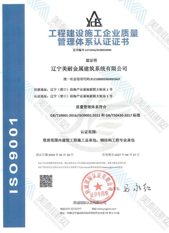 遼寧美耐金屬建筑系統(tǒng)有限公司位于遼寧(營口)沿海產(chǎn)業(yè)基地,專注于預制金屬建筑系統(tǒng)領域,是一家集工業(yè)建筑設計、制作、施工及相關(guān)的技術(shù)咨詢與服務為一體的綜合性服務企業(yè)。作為國家鋼結(jié)構(gòu)協(xié)會會員、中國建筑金屬結(jié)構(gòu)協(xié)會會員單位與國家高新技術(shù)企業(yè),美耐建筑集建筑工程施工總承包、鋼結(jié)構(gòu)工程專業(yè)承包等多種資質(zhì)于一身,并擁有22項鋼結(jié)構(gòu)建筑領域?qū)@?項軟件著作權(quán)。